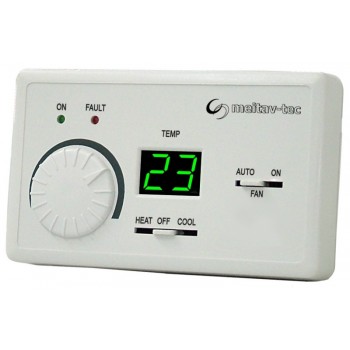 Termostat/kontroler kvadratnog oblika sa kruznim regulatorom za izbor temperature, prekidačem on/off, prekidačem hlađenje / grejanje, 2 lampice za indikaciju protoka, rada kompresora i prekidača brzine ventilatora Auto/on. Kontroliše kompresor klima jedinice pomoću strujnog releja, dok unutrašnji ventilator uređaja radi po izboru u toku rada uređaja ili odvojeno. Nema mogućnost otapanja. Poseduje ekran i mogućnost zapisa temperature prostora. Povezuje se lako jer koristi međunarodne modele priključaka kao svi uređaji od 24V. Mogucnost aktiviranja cetvorokrakog ventila na hladjenju ili grejanju.